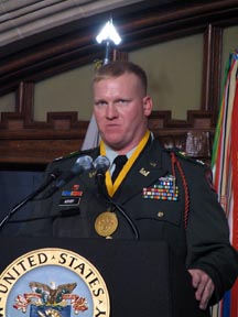 Captain Ashby ’01 then received the Nininger medallion from the Superintendent and the Chairman, posed for photographs, and took his place at the podium. He delivered a superb acceptance speech, and the Corps seemed to hang on each word as CPT Ashby described the shadows of previous graduates that occupied the recesses of Washington Hall. He then described some of his combat engineer platoon’s challenges during the attack to Baghdad in the spring of 2003. CPT Ashby went on to emphasize his Soldiers’ extraordinary efforts over the three weeks of continuous combat operations. In closing, the awardee focused on the importance of discipline and teamwork in combat, and he echoed the Commandant’s exhortation to the members of the Corps that they would be well prepared for the battles in which they would lead in the future.