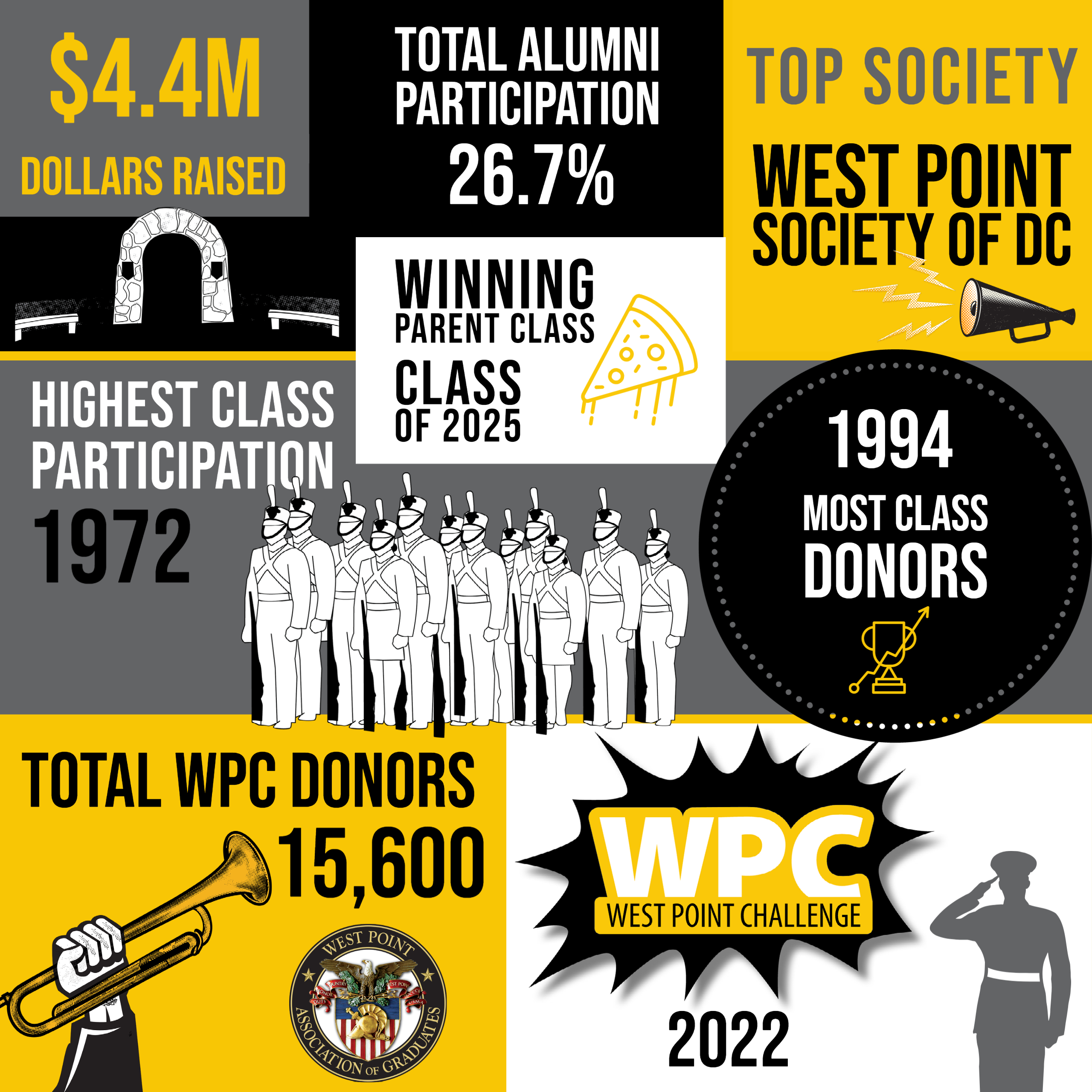 With gifts totaling $4.4 million dollars, every part of West Point was impacted this week. Over 330 different funds, including 100 Directorate of Cadet Activities (DCA) Clubs, received Margin of Excellence gifts. The Class of 2025 Parents won the Parent Challenge and pizza for their cadets this weekend.
